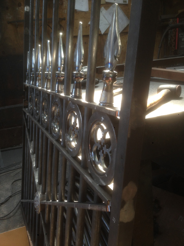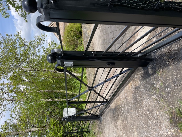 Gate with scroll work and dog motifGate with scroll work and dog motifParkland fencingVehicle gate with scrollwork and decorative gate posts